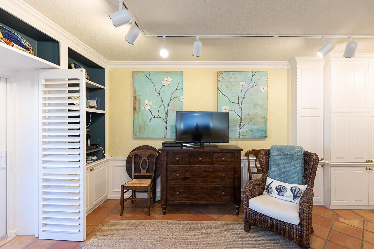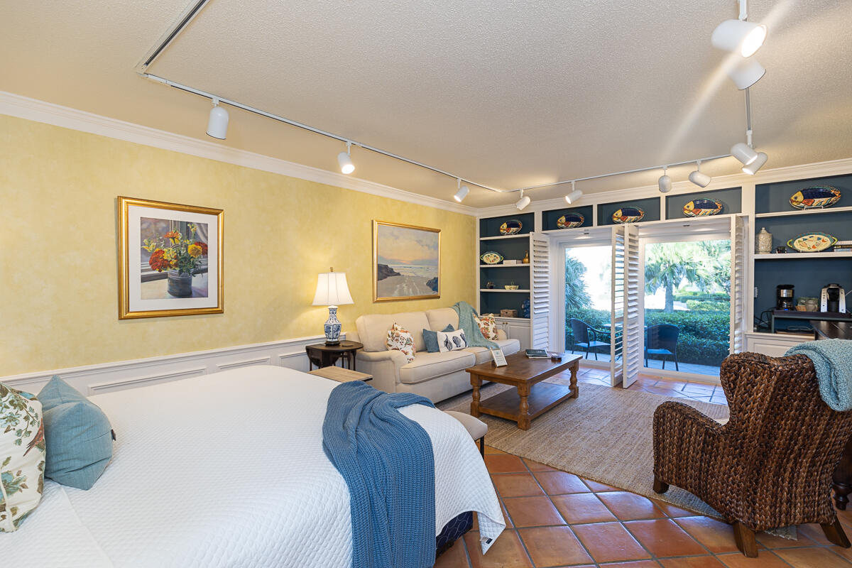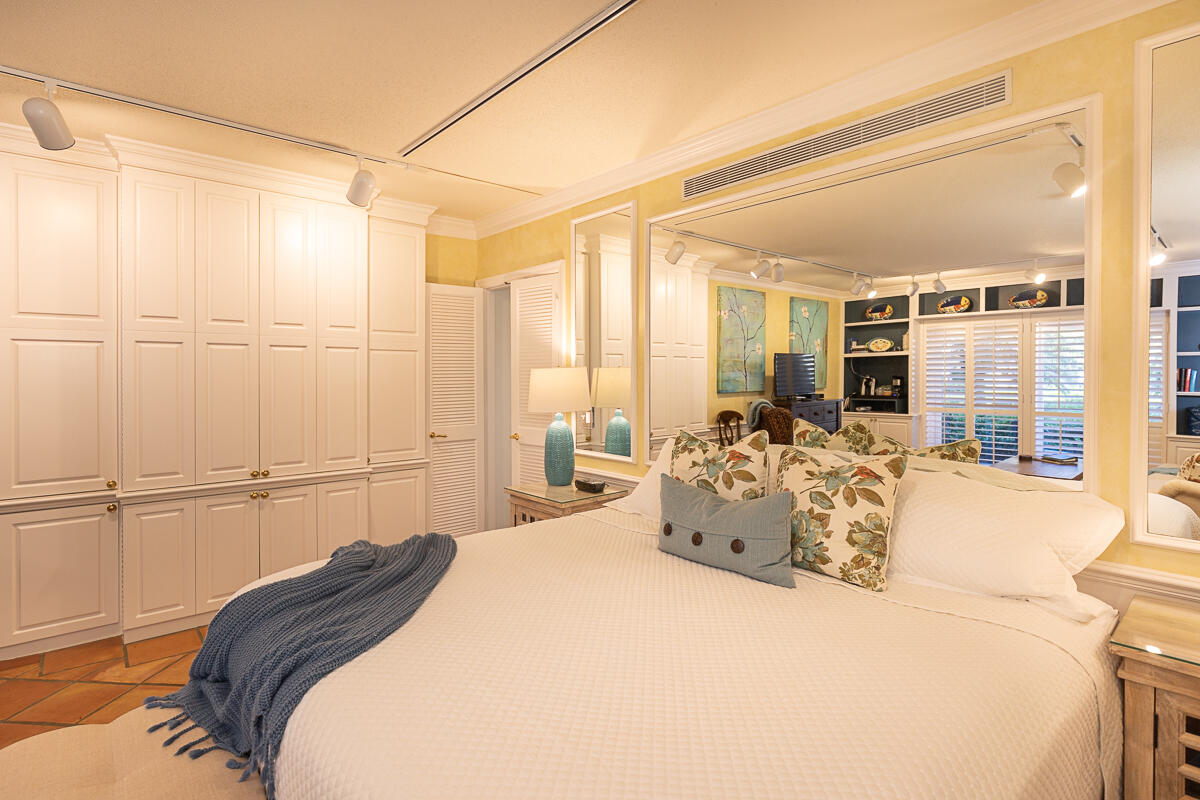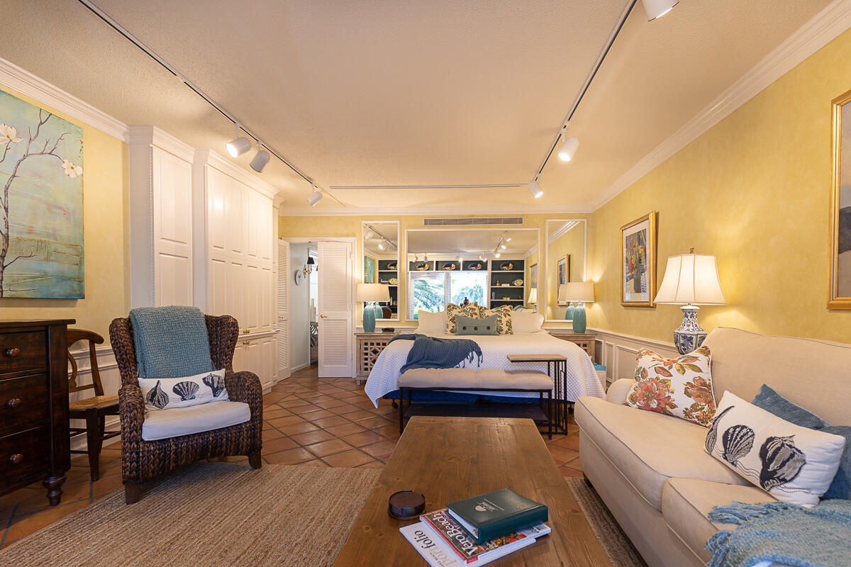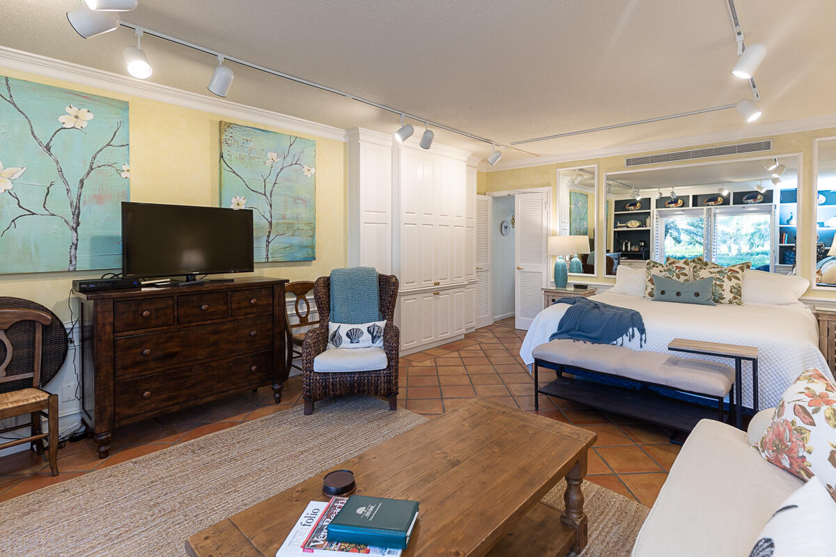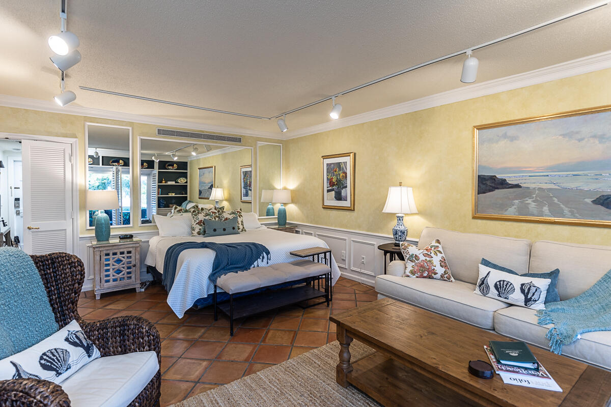 Conveniently located next to the Beach Club is this exquisitely renovated, fully furnished, 1BR/1BA studio efficiency. Enjoy gentle ocean breezes from the covered terrace overlooking the tropically landscaped courtyard pool. Boasting Approx. 590 square feet, features include custom built-ins and millwork, top-of-the-line kitchenette and bathroom, plantation shutters, large storage closet, washer/dryer and private beach access. (Renter note: Sleeper sofa-bed / NO SMOKING)