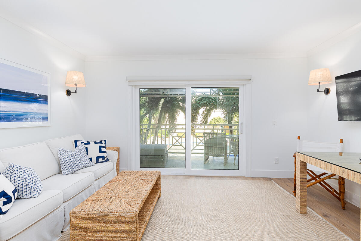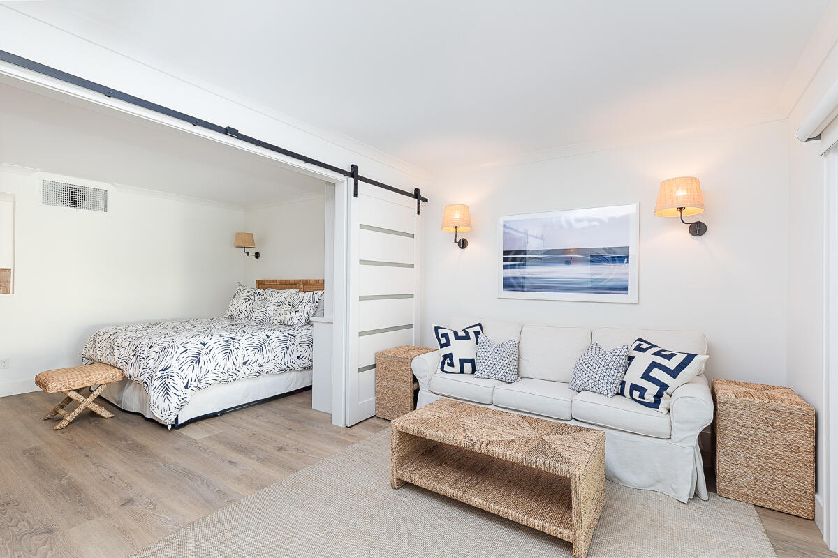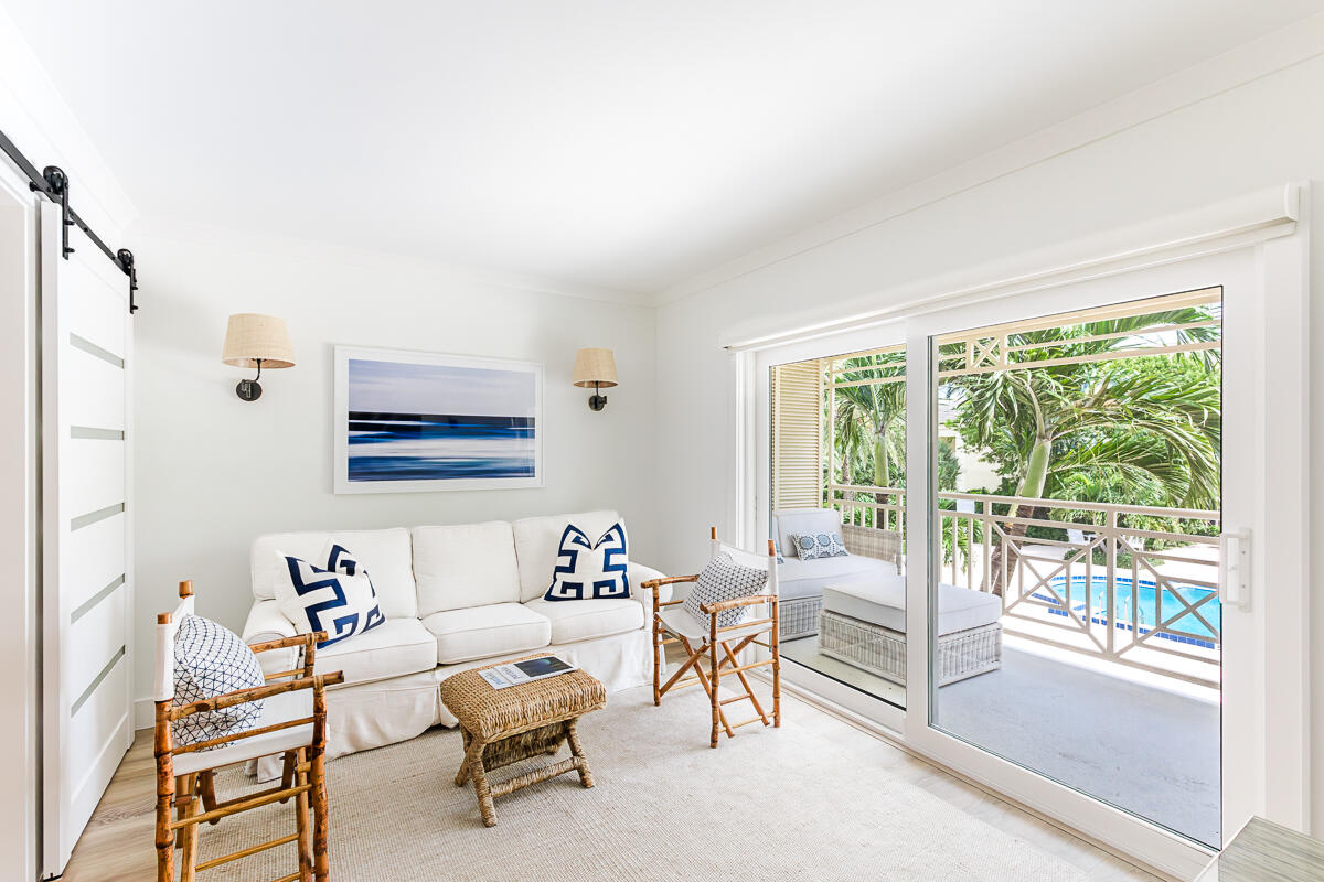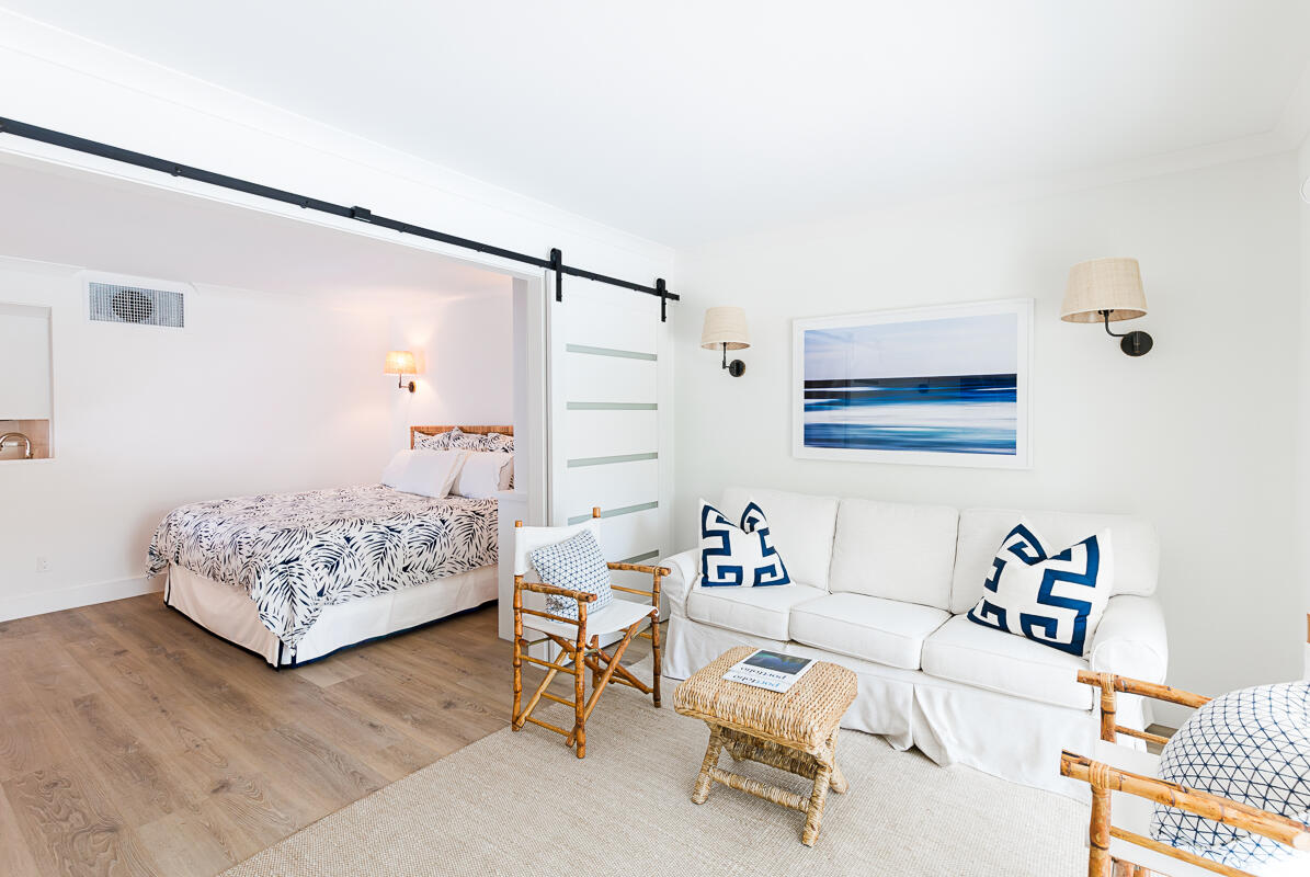 Complete with access to the private beach and pool, this inviting and well-designed studio is a delightful respite from life's demands. Conveniently in the heart of the beachside, this beautifully updated and fully-furnished 1BR/1BA studio overlooks the lush tropical courtyard pool. Indulging in soothing southern breezes, the bright and airy 590± square foot residence is designed to host separate living spaces divided by a sliding barn door for privacy, as well as gorgeous custom built-ins for added storage. A unique kitchenette with a stovetop for light cooking is enhanced by a full refrigerator steps away. Other features include an airy bathroom with dual vanities, closet with washer/dryer, and a serenely private covered balcony. (Rental Note: Sofa sleeper)