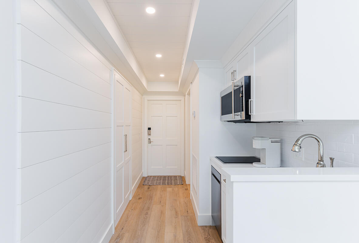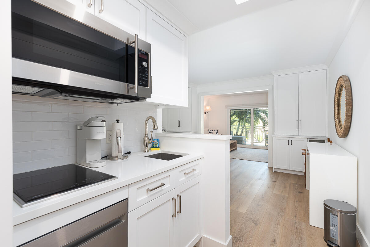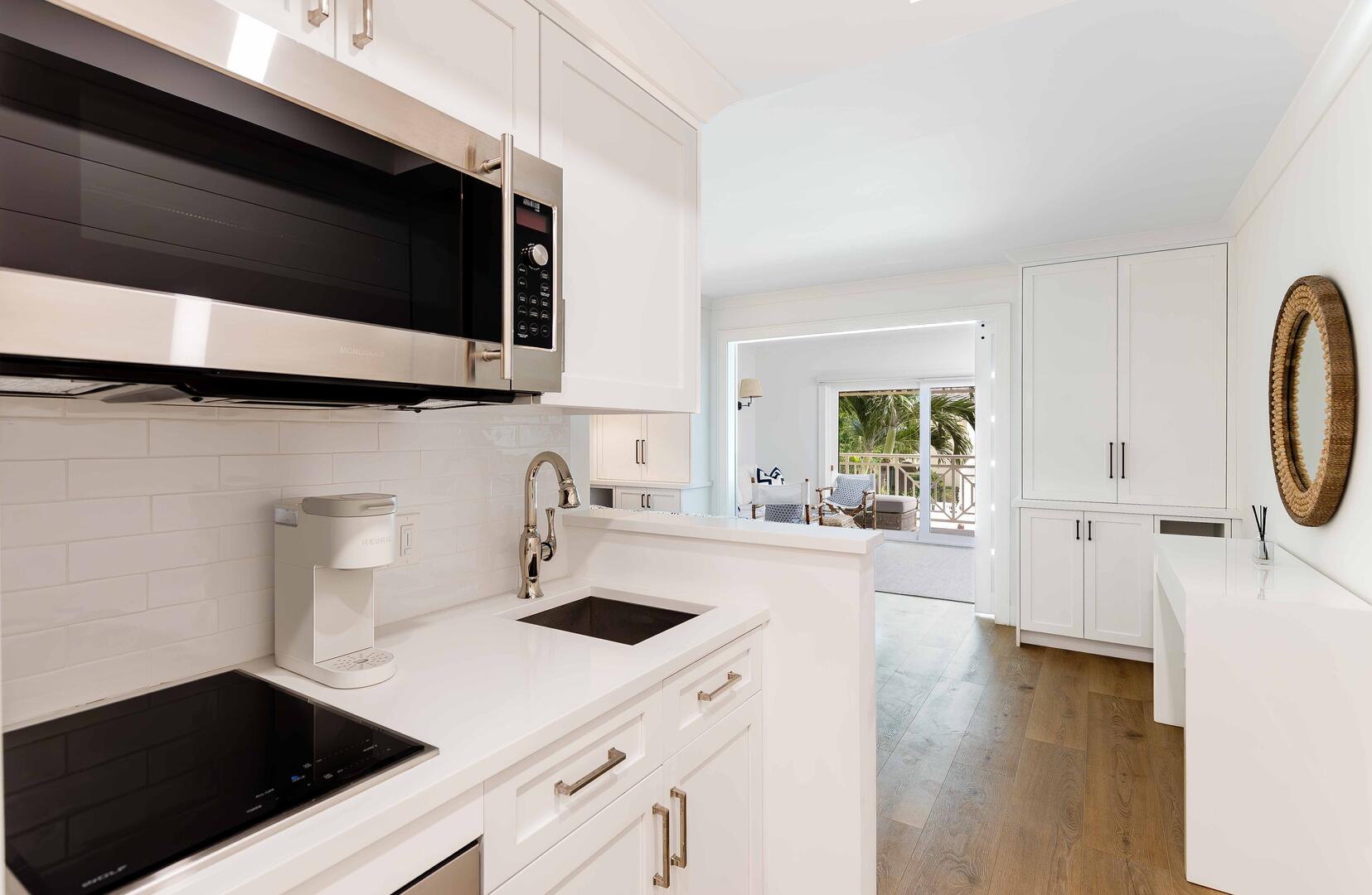 Complete with access to the private beach and pool, this inviting and well-designed studio is a delightful respite from life's demands. Conveniently in the heart of the beachside, this beautifully updated and fully-furnished 1BR/1BA studio overlooks the lush tropical courtyard pool. Indulging in soothing southern breezes, the bright and airy 590± square foot residence is designed to host separate living spaces divided by a sliding barn door for privacy, as well as gorgeous custom built-ins for added storage. A unique kitchenette with a stovetop for light cooking is enhanced by a full refrigerator steps away. Other features include an airy bathroom with dual vanities, closet with washer/dryer, and a serenely private covered balcony. (Rental Note: Sofa sleeper)