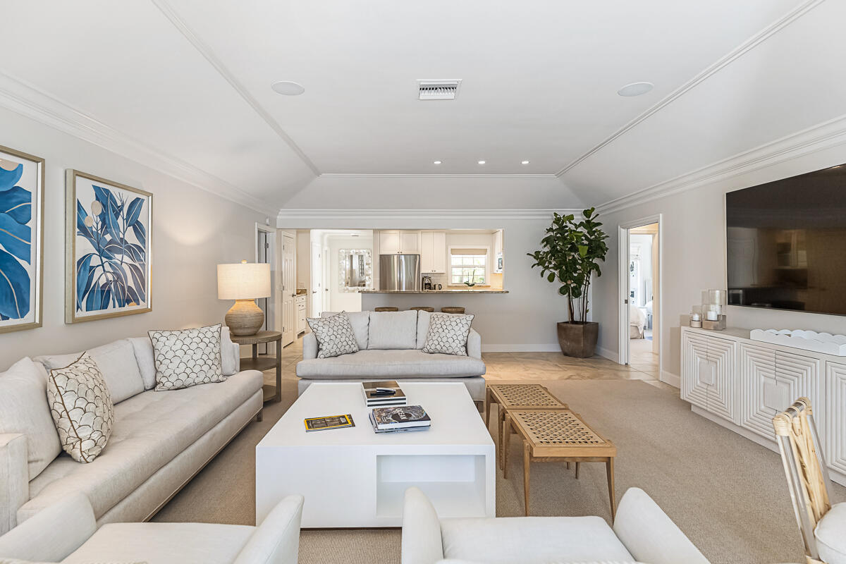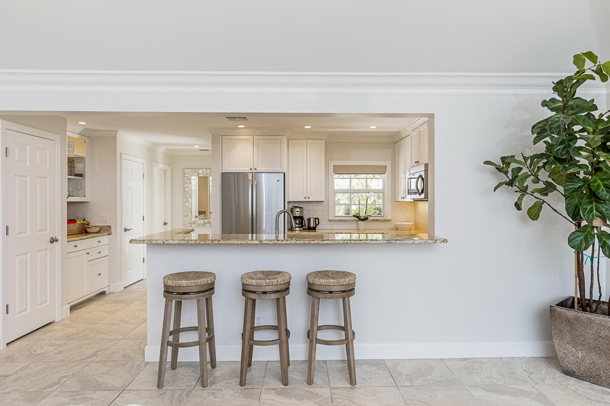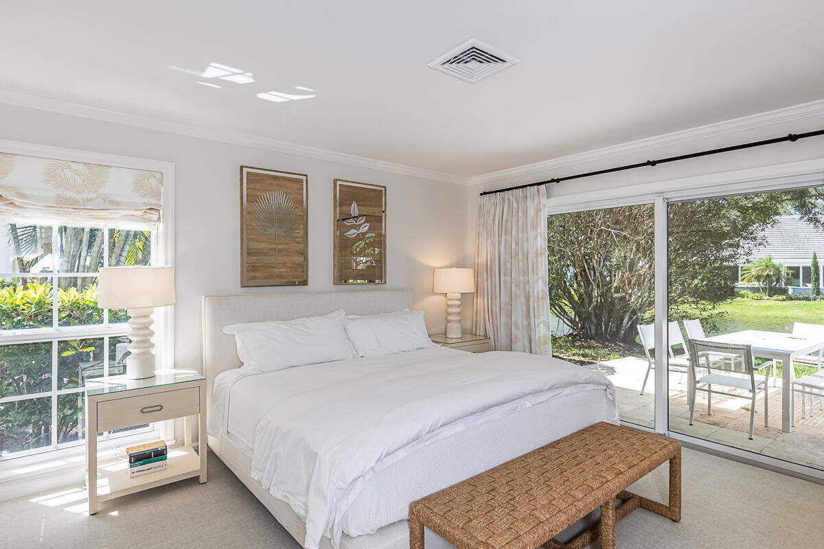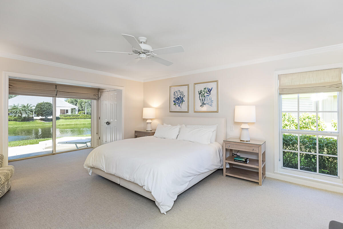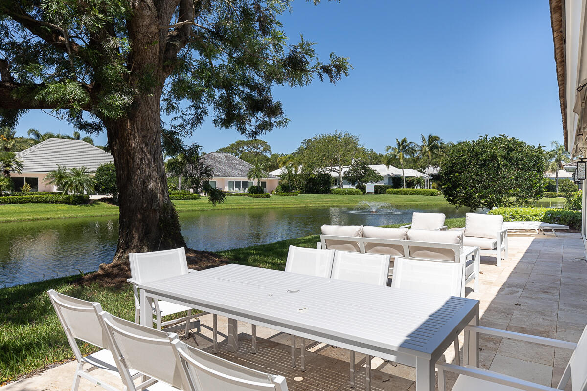 Surrounded by palms, mature oaks, and lush gardens is this beautifully updated 3BR/2BA South Village cottage located along a lake. Well-appointed and boasting an inviting and spacious interior, this residence capitalizes on serene water views and ample space. Relax on the outdoor patio overlooking the lake fountain, whether on the chaise loungers, or dine outside to enjoy the view. Similar highlights of this tranquil property include an expansive master suite with desk/reading nook, tray ceilings, and comfortable bathroom with walk-in shower, two guest suite - one with sliders that lead to an outdoor patio, additional 1-car garage, gourmet kitchen with bar seating, and welcoming living room. Nearly every room enjoys enticing vistas of South Village lake. Located near the south gate, it is just a short walk to the private South Village tennis courts and swimming pool.