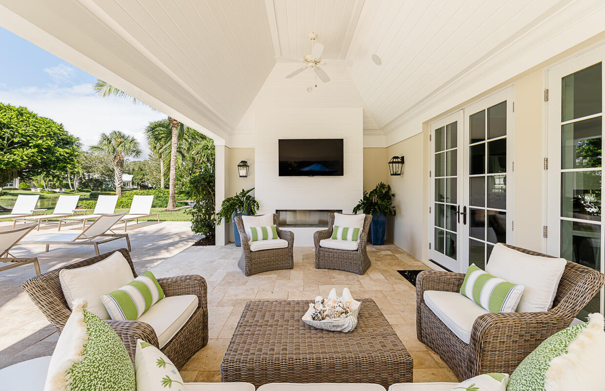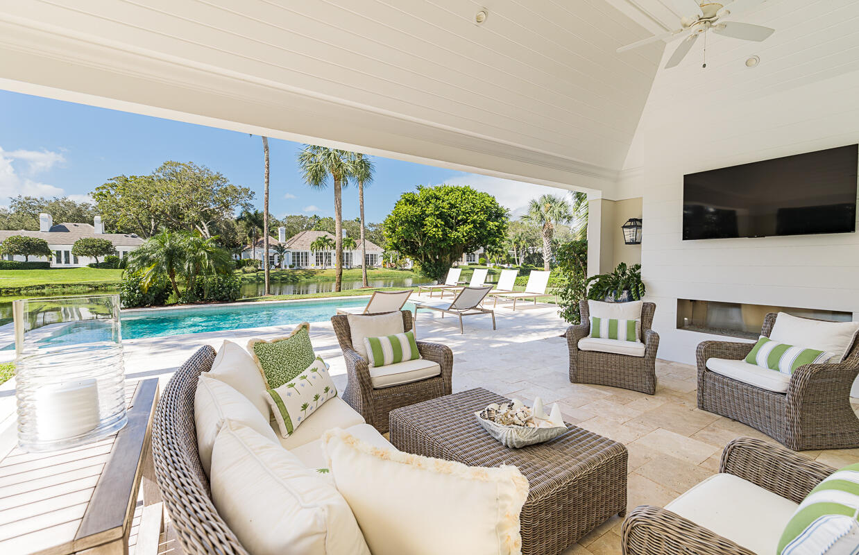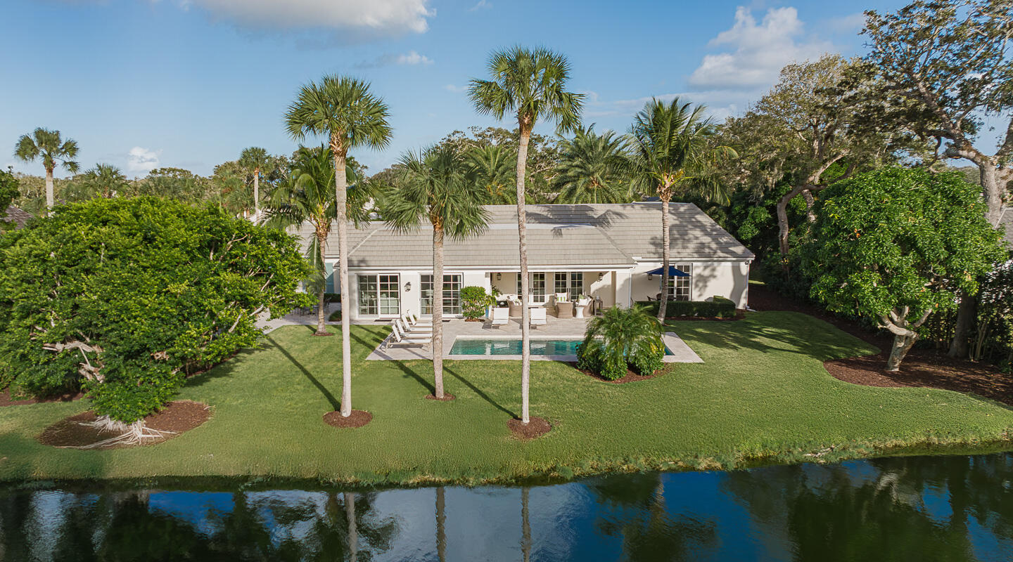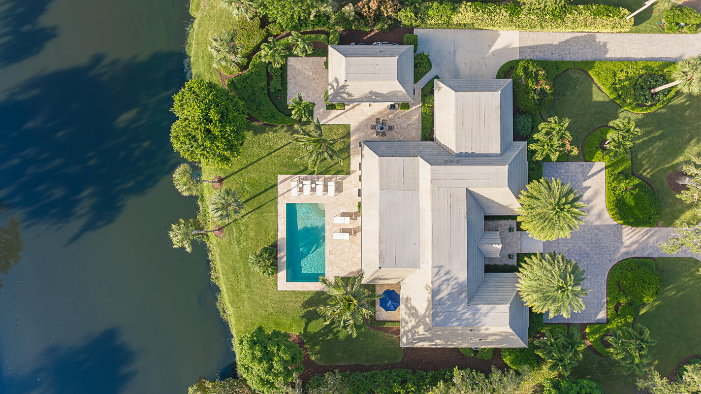Gorgeously appointed with coastal chic interiors, this spacious and comfortable 4BR/5.5BA lakefront retreat is perched along Indian Lake and exudes serenity. Lush, well-manicured landscaping accents the sprawling .57± acre property, where it feels private and capitalizes on excellent indoor/outdoor living. Crystal blue pool and lake views take centerstage, with a covered veranda with fireplace and plenty of exterior terraces to entertain. The main house features an inviting living room with soaring ceilings, dining area, custom millwork, and a stunning fireplace that anchors the space. A gourmet island kitchen enjoys warm ambient light and plenty of space, and adjoins a comfortable family room with built-ins and lake views. A detached guest cabana suite complete with kitchenette provides a wonderful spot for friends and family alike. At a gracious 4,415± GSF along a serene stretch of a private lake, this striking home is an exciting offering on Indian Harbor.
